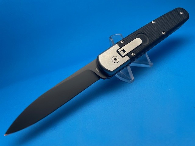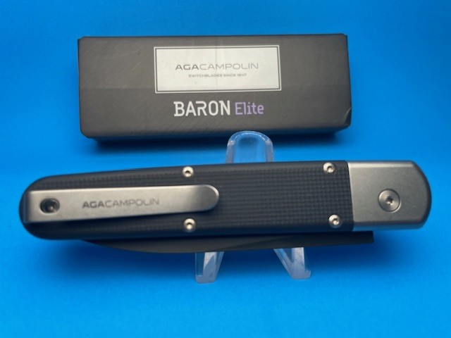 We are excited to present you the latest switchblade from the italian knifemaker company A.G.A Campolin the Baron Elite. This automatic knife is the modern evolution of the Baron build with the same leverlock mechanism like the successful “Zero”. It has N690Co stainless steel drop point blade with black PVD coating and solid stonewashed AISI 420 steel liners and bolsters. The double spring gives faster action and guarantees longer durability where the inverted lever ensures quick opening action. The handle is made of black G-10 with a 3d texture for a better grip and comes with a stainless steel pocket clip. The springs are very easy to replace and the Baron Elite comes with an extra spring in the carbon paper box. This new Baron Elite leverlock is an exellent quality EDC.