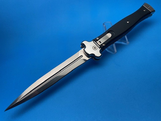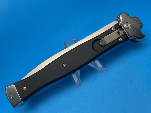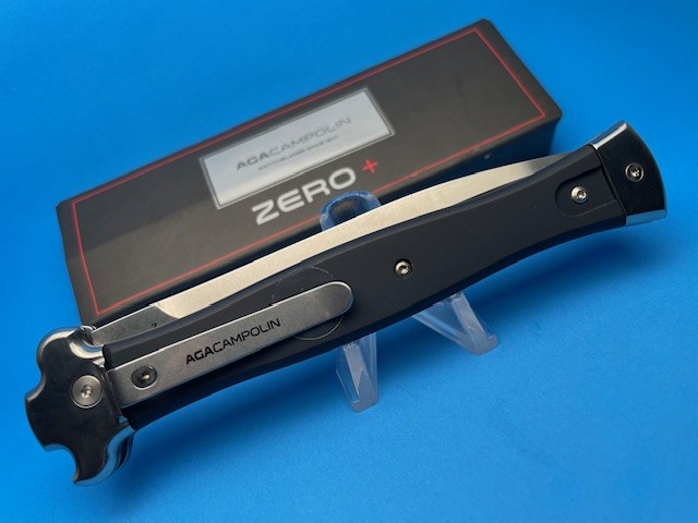 ZERO+ is a modern stiletto with leverlock mechanism and is the longest leverlock available!! It has a stainless steel N690Co Daga blade with polished mirror finish and a solid AISI 430 steel glass blasted bolster. The double spring gives faster action and guarantees longer durability. The inverted lever gives a quick opening action. The Black Aluminium handle has a 3d texture for a better grip. The stainless steel pocket clip can be easily removed and replaced with a steel shield.