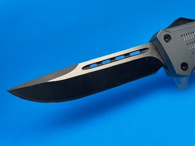 This is a Dual action, Two tone finished vented blade with blood groove.