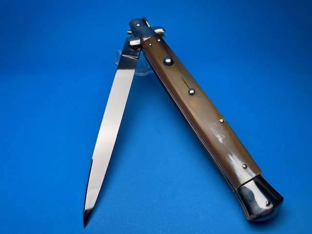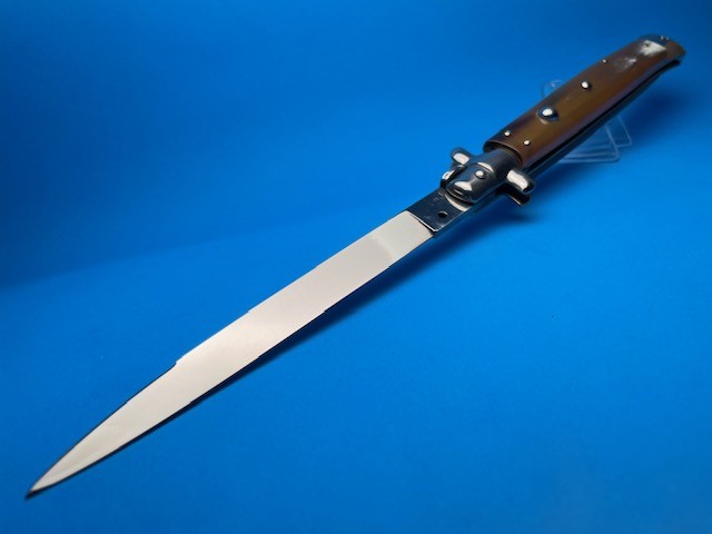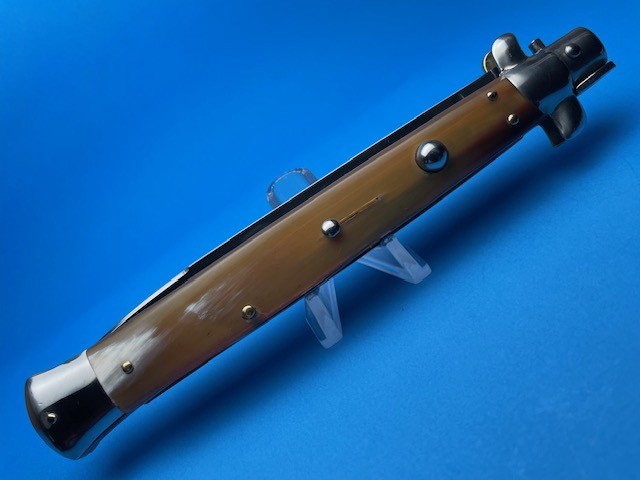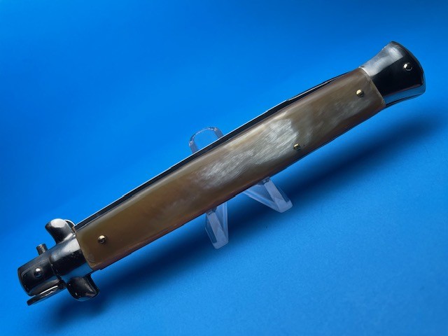 This is a fully auto leaf spring fired classic style design meaning once the blade is in the open and locked position, you pivot the top bolster out to unlock and close the blade. These knives feature a sharpened 440C stainless steel blade with various styles of handle scales and stamped stainless steel bolsters at both ends. The Blade is marked “FRANK B Italy”.