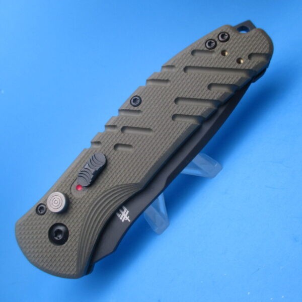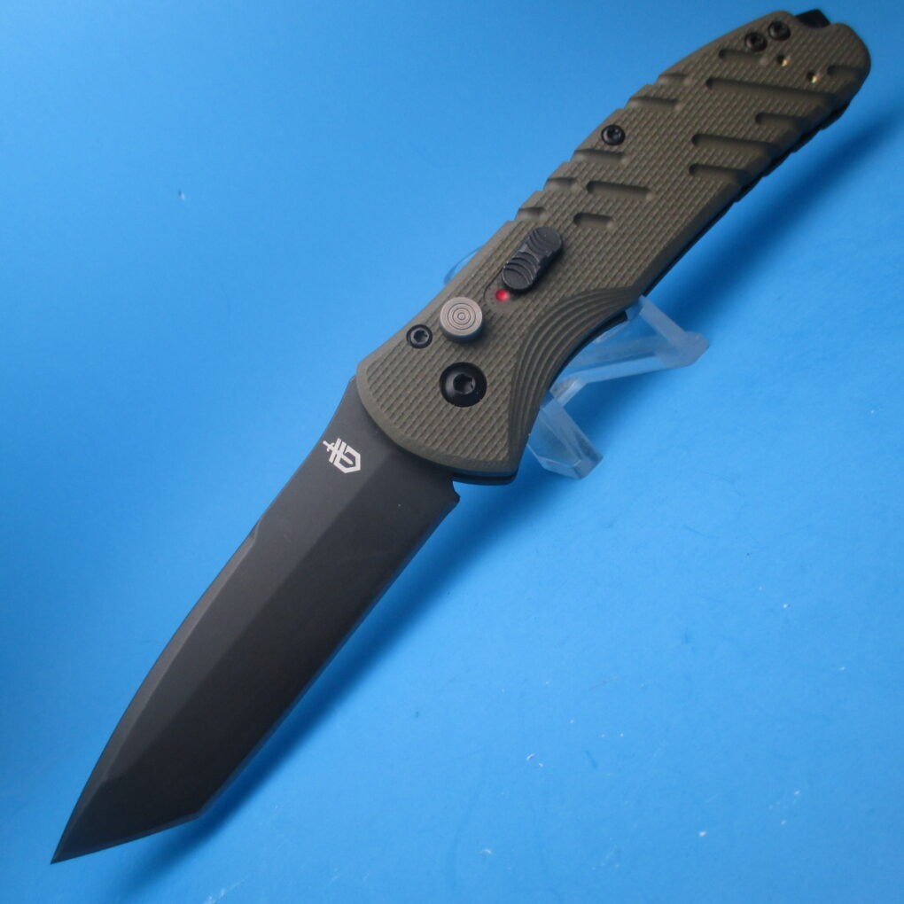 THE GERBER PROPEL DOWNRANGE TANTO POINT PLAIN-EDGE SWITCHBLADE KNIFE A HUGE FAVORITE OF LAW ENFORCEMENT & MILITARY Gerber Propel Downrange Auto Robust and just the right size, the Propel Downrange Auto is another military-grade addition to Gerber’s acclaimed line of Automatic knives. Green G-10 handles provide a confident grip around the ergonomic body and a multi-position pocket clip allows the operator to carry it wherever and however they see fit. The tanto-tip, S30V steel blade is black oxide coated for corrosion resistance and a low visual profile. Made in the USA. 8 1/2″ ov, 3 1/2″ bl, 5” cl.