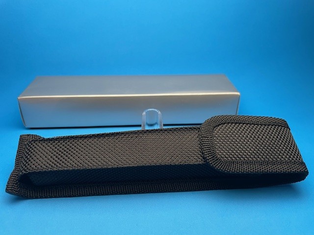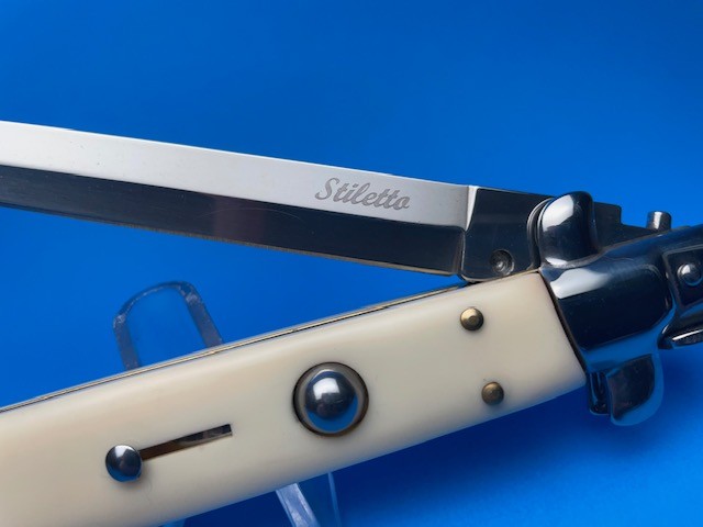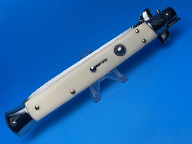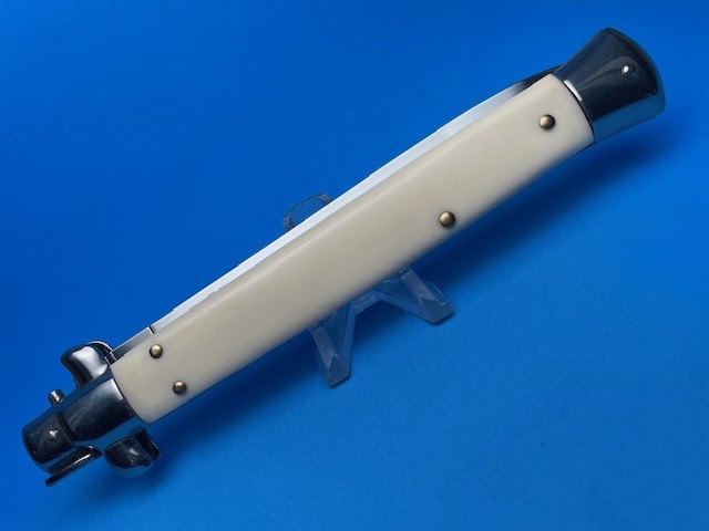 This gigantic switchblade sits at 13″ overall length. A push of the button flings the 5″ blade open. Each knife comes with a nylon sheath and has a safety switch on the handle to prevent accidentally opening.